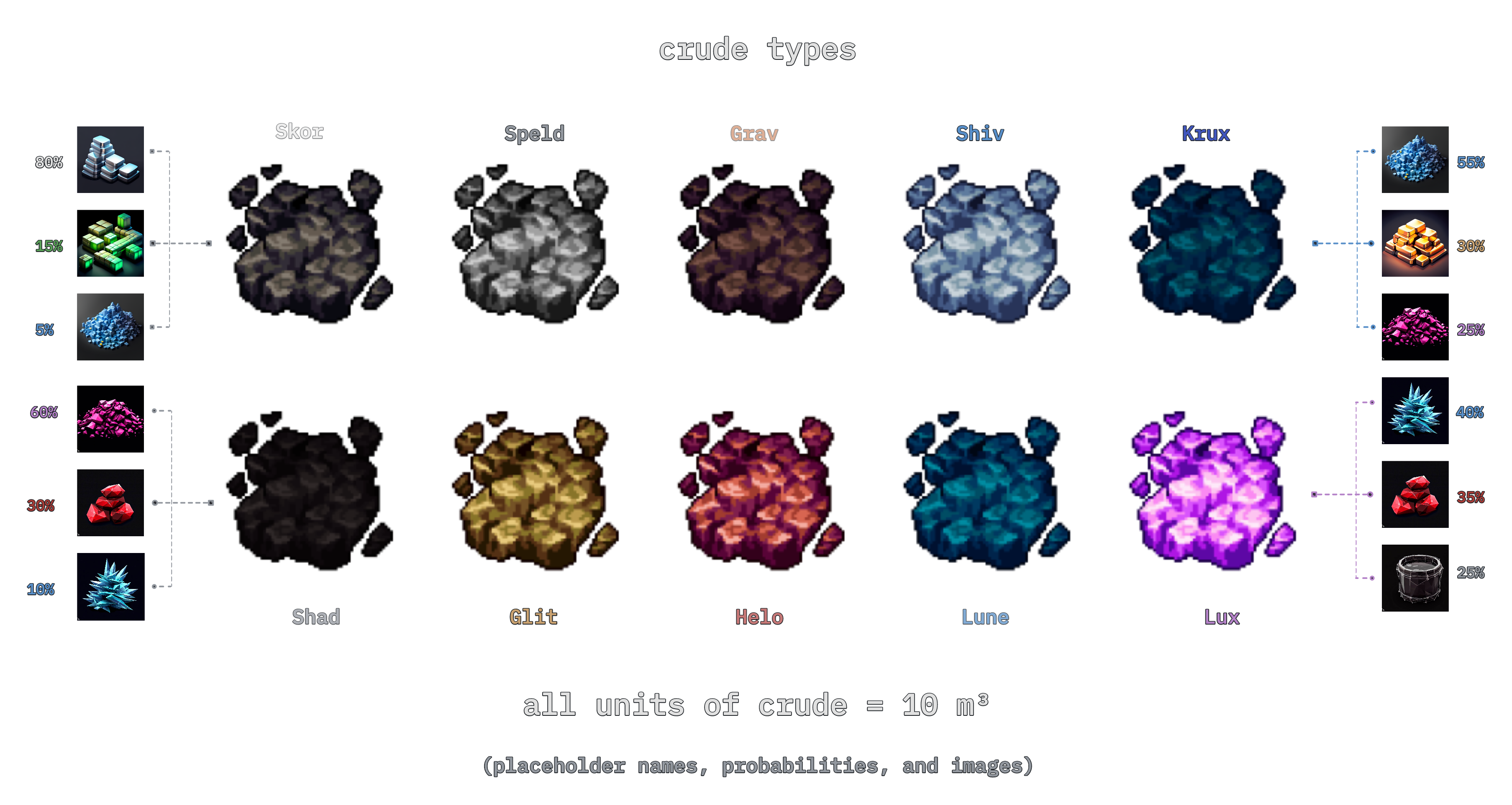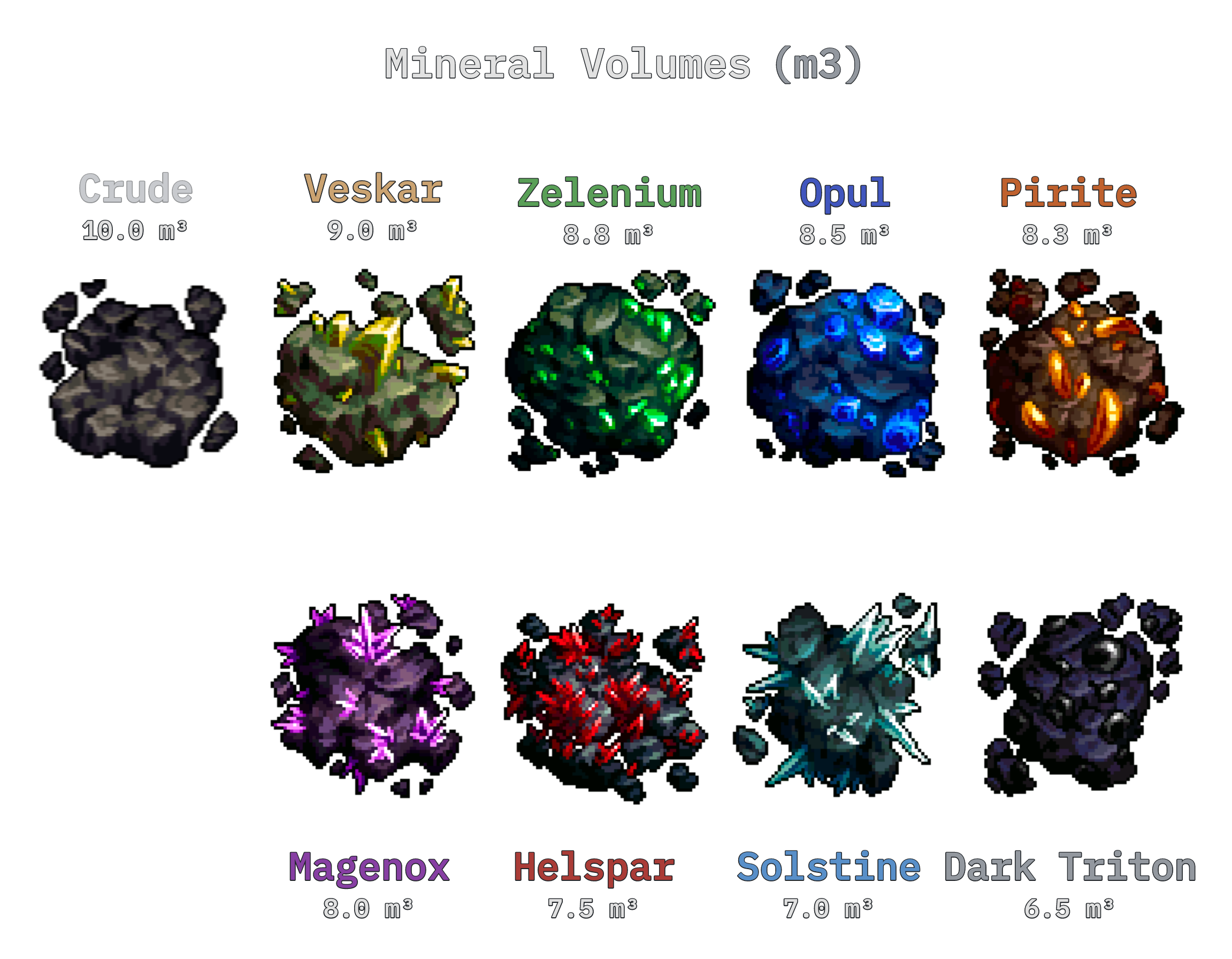 Asteroid belts now consist of various types of crude ore rather than the original eight named ore types. Each type of crude contains a different composition of these original eight resources, now called "minerals."
