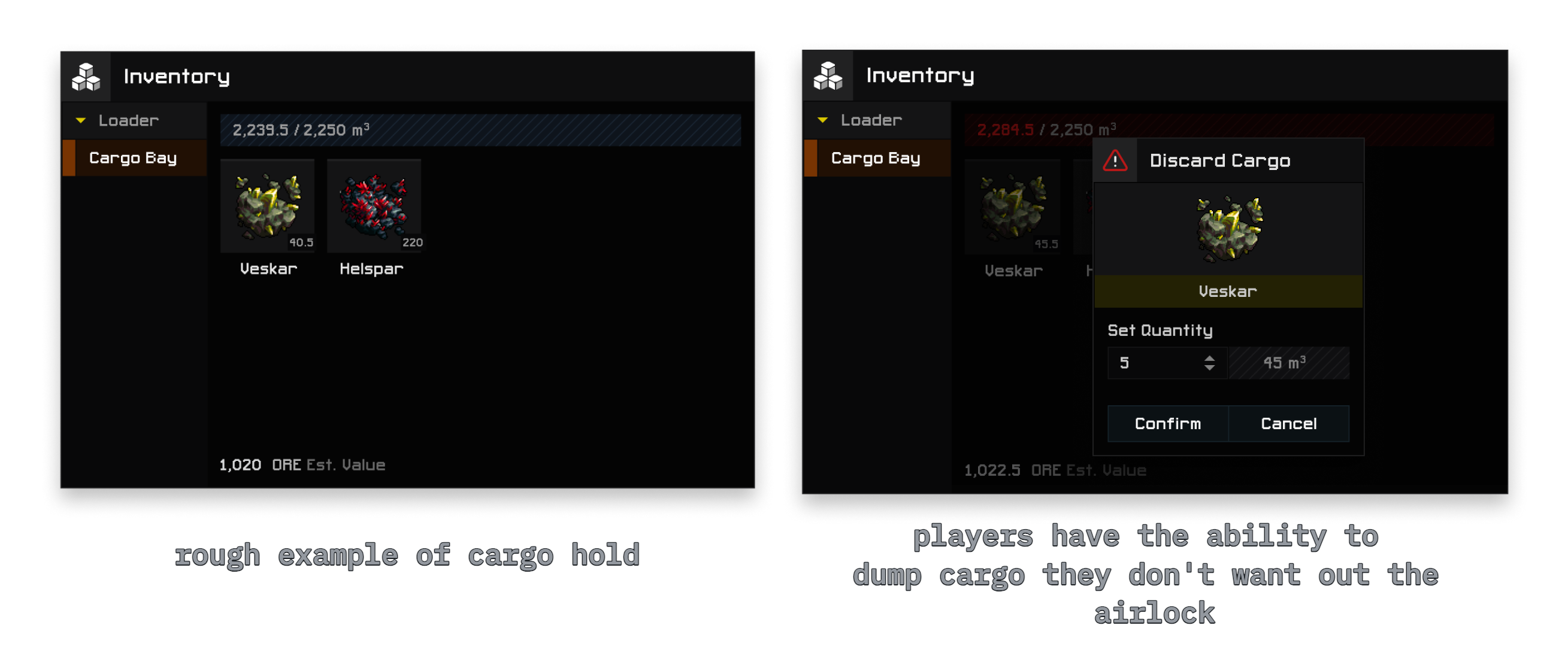 The central constraint of the cargo system is that players have to worry about exceeding their ship's cargo capacity. However, this introduced something of a problem with the original system since there was no good way to get feedback on how much crude a ship would be taking onboard until after claiming.