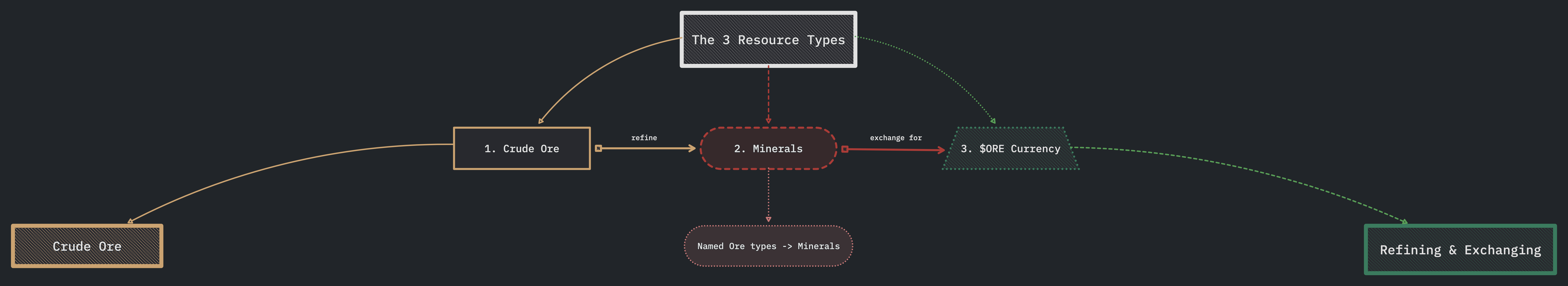 Minerals and crude are tangible resources. Unlike the ore token, they occupy space at a specific location and only exist within the game world (not tokenized). Crude can be used for fuel, but at significantly lower efficiency than the ore token. All ships, including marauders, will eventually have to return to an outpost to trade their crude or refine it into minerals.