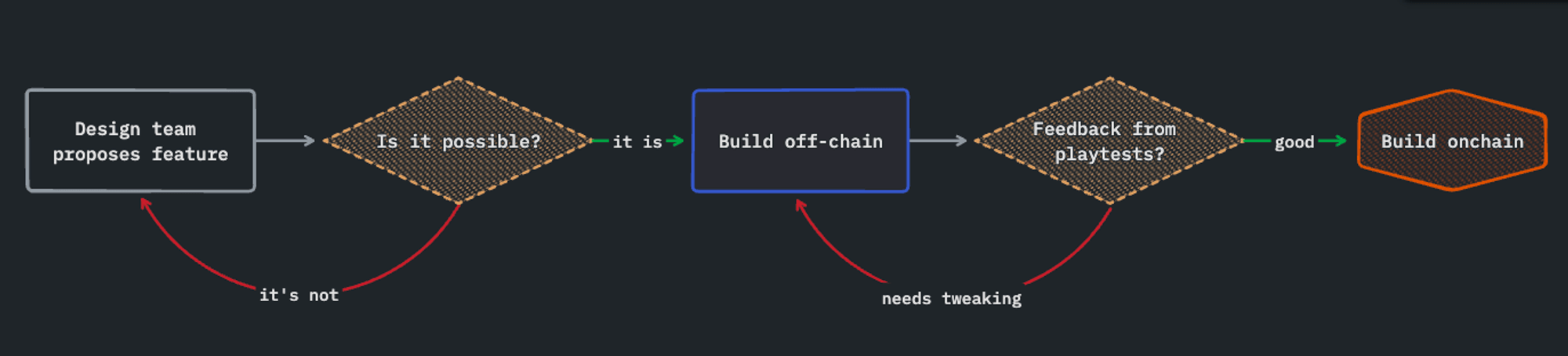 Our original development process involved committing a significant amount of time to onchain implementation before validating whether a feature was even worth it through playtesting. This made our speed of iteration between internal playtests simply too slow.