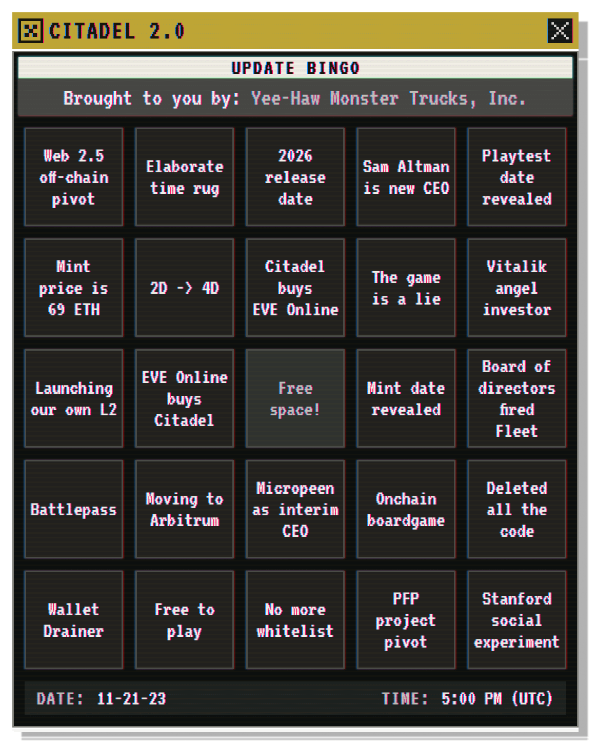If you would kindly check under your seats, you'll each find a complimentary "Citadel 2.0 Update Bingo Card" has been provided. Those of you who are lucky enough to get a bingo will be rewarded with an all-expenses-paid trip to the Shadow Realm.